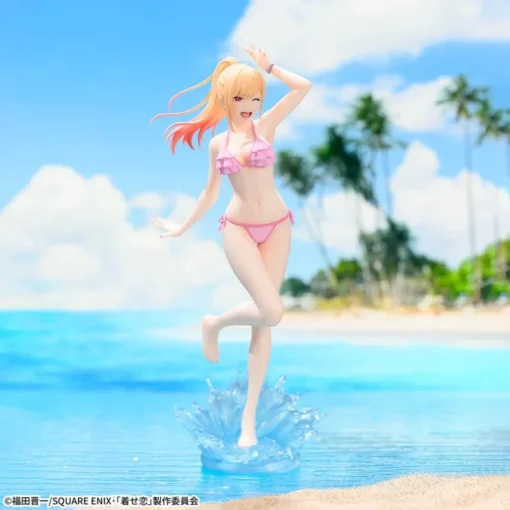De My Dress-Up Darling XStellar PVC Statue Marin Kitagawa 20 cm brengt de energieke Marin Kitagawa tot leven in een zomerse en speelse pose! Ze draagt een stijlvolle bikini en maakt haar kenmerkende peace sign boven haar hoofd, terwijl het dynamische voetstuk van opspattend water de indruk wekt dat ze vrolijk door de branding rent. De levendige kleuren en subtiele details vangen perfect haar vrolijke en zelfverzekerde uitstraling — een must-have voor elke My Dress-Up Darling-fan!